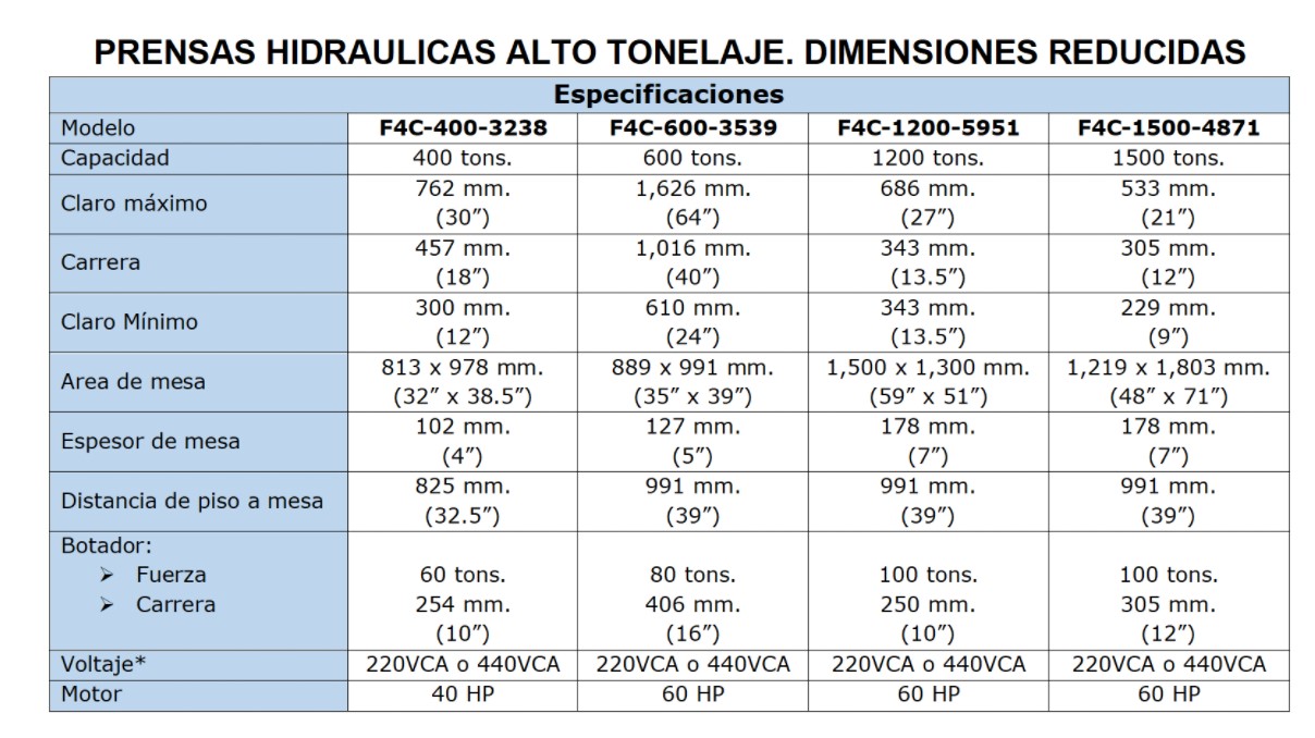 Fluidica, S.A. fabrica modelos con rango de tonelaje de 30 hasta 2000 toneladas.